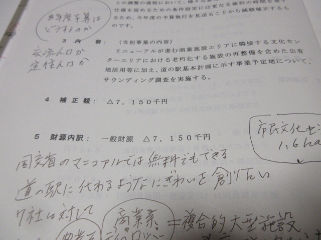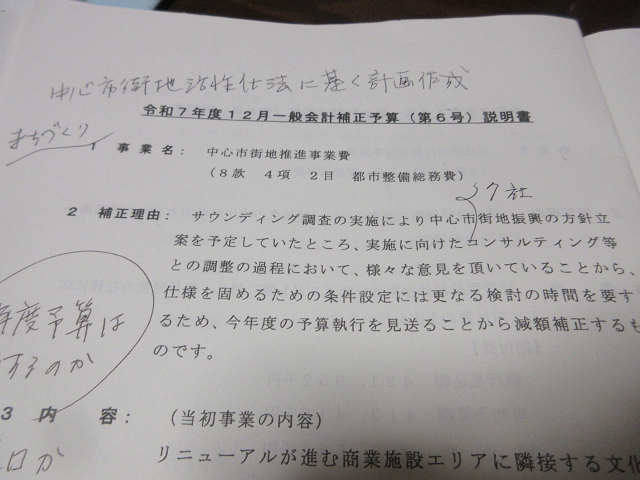 市長は3月の予算編成時に715万円をかけて中心市街地の活性化に関わる費用{サウンディング)を予算建てしました。所がこの「中心市街地」なるものを市長はどのエリアだと考えているのかよくわかりません。文化会館や図書館まで含むのか否か又道の駅予定地であった農振農用地をどのように考えていくのかはっきりした答えもビジョンもしめされませんでした。不思議なこともあるものです。中心市街地活性課という新たな部署にたびたび訪ねて「今の進捗状況は?」と聞いてもかんばしい答えが無く9月の本会議では私は「サウンディングは本当に必要か」と糺しました。市長は「やります」との答えだったので「本当に中心市街地としていいものが生まれるなら応援します」とはなしました。、、、、、、、が!今回の本会議では「サウンディングができなかった」ということで715万円を減額補正しました。やるつもりだったができなくて予算で積み上げたものをないものとしたのです。私は30年も議員をやってきましたがこんな失態ははじめてです。呆れました。職員がかわいそうです。そういうことで今回の補正予算には反対の立場をとり、会派としての反対討論を畑井