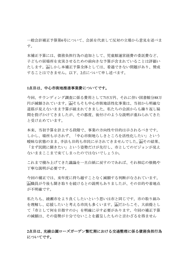 市長は3月の予算編成時に715万円をかけて中心市街地の活性化に関わる費用{サウンディング)を予算建てしました。所がこの「中心市街地」なるものを市長はどのエリアだと考えているのかよくわかりません。文化会館や図書館まで含むのか否か又道の駅予定地であった農振農用地をどのように考えていくのかはっきりした答えもビジョンもしめされませんでした。不思議なこともあるものです。中心市街地活性課という新たな部署にたびたび訪ねて「今の進捗状況は?」と聞いてもかんばしい答えが無く9月の本会議では私は「サウンディングは本当に必要か」と糺しました。市長は「やります」との答えだったので「本当に中心市街地としていいものが生まれるなら応援します」とはなしました。、、、、、、、が!今回の本会議では「サウンディングができなかった」ということで715万円を減額補正しました。やるつもりだったができなくて予算で積み上げたものをないものとしたのです。私は30年も議員をやってきましたがこんな失態ははじめてです。呆れました。職員がかわいそうです。そういうことで今回の補正予算には反対の立場をとり、会派としての反対討論を畑井