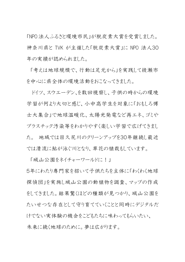 神奈川県とTVKが主催する「脱炭素大賞」の表彰式で神奈川県庁に行ってきました。議員になって間もなく立ち上げた「NPO法人ふるさと環境市民」の仲間とともに喜びあいました。30年の期間たくさんのこどもたちと環境を学んできましたが当時は「温暖化は防止できるもの」と、信じていて子供たちにも「みんなの地球だからたいせつにしようね。」と本気で言っていましたが、、、、。小泉総理の時にリオデジャネイロで国際会議が開かれてその時小泉総理は「環境学習の10年」を提唱され私たちのような弱小の団体にも活動資金が降りてきました。世界中で「温暖化防止」が叫ばれた時代でしたが、安倍総理に変わってからは全くとりあげられることがなくなりました。